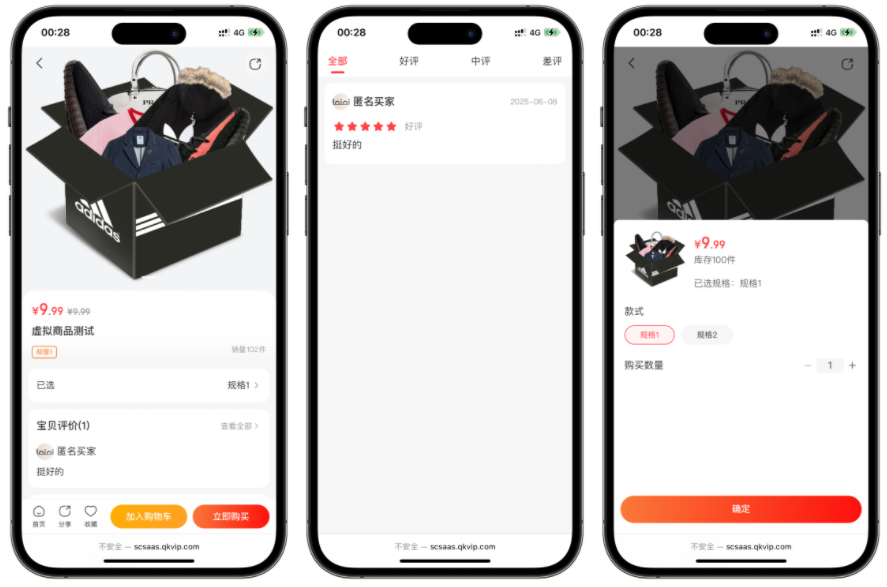 * 商品管理:支持实物和虚拟商品,多规格商品管理,并带有商品评论功能。