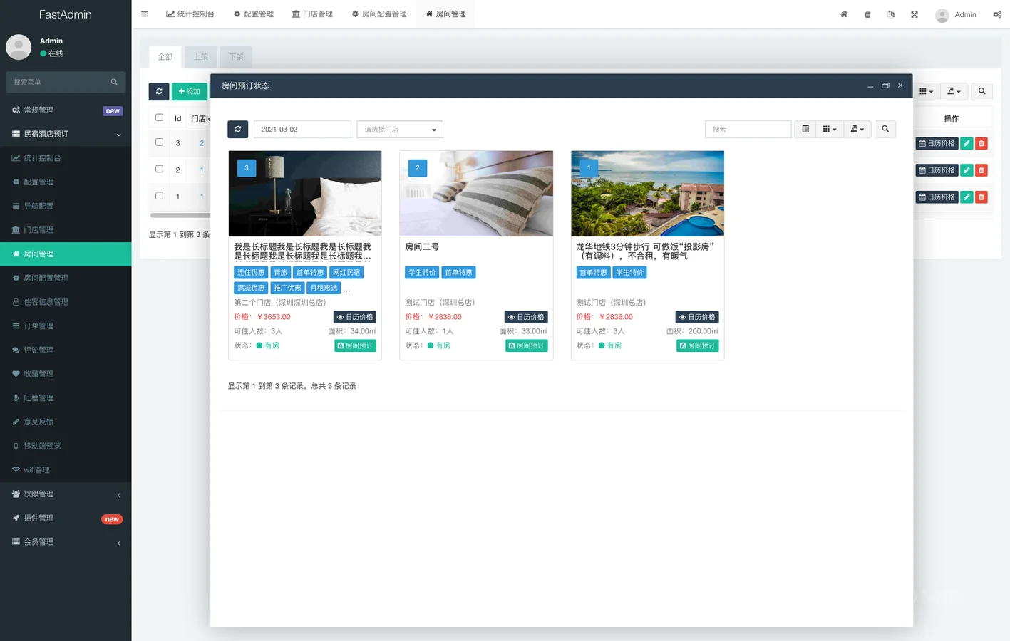2. 房间搜索:允许按日期搜索房间状态,以及按日期区间搜索。