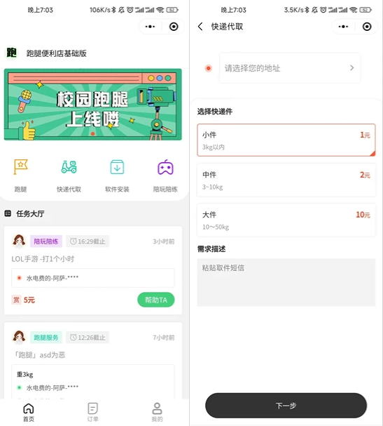 这套开源的校园跑腿便利店小程序系统源码,后端采用mIdway3.0框架,前台采用nuxt2.x技术构建,小程序部分则通过uniapp实现。系统包含跑腿、快递代取、陪练陪玩、软件安装等多种功能。用户可以通过该系统申请接单、下单,并可以进行提现操作,系统还提供了物品重量计算功能。