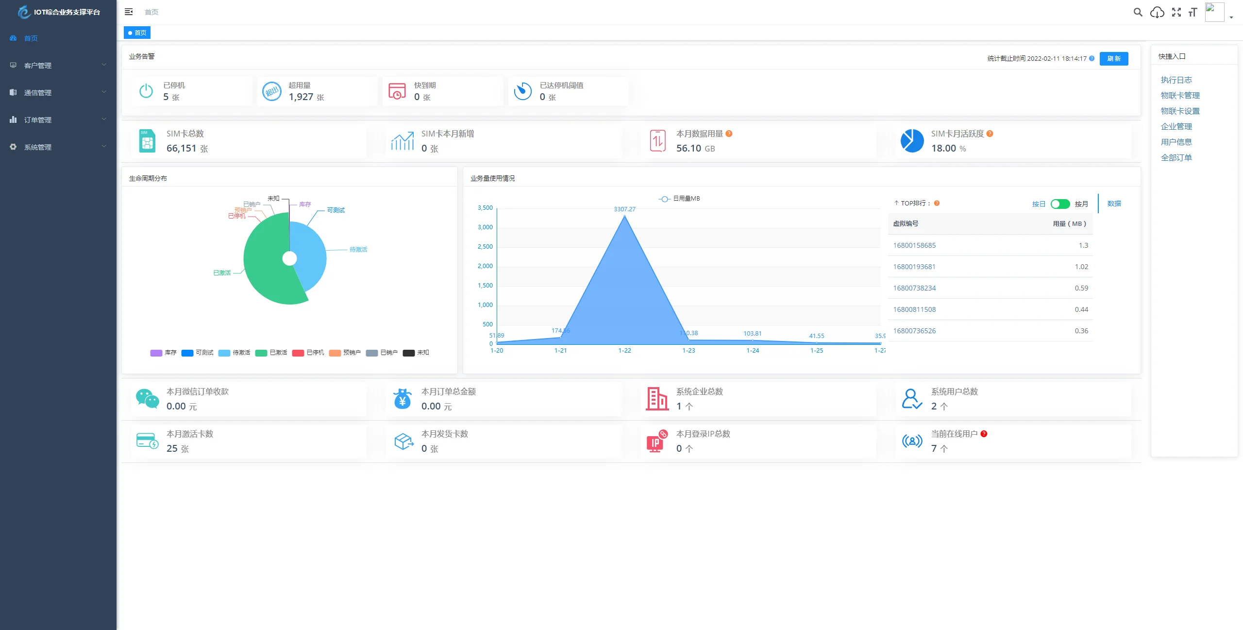 该解决方案是一个基于 SpRIngBoot、VuE、Mybatis、RabbitMq、Mysql 和 Redis 等技术开发的轻量级物联网综合业务支撑平台。它支持物联网卡、物联网模组以及卡+模组融合管理,提供状态监测、资费管理、客户管理、进销存管理、合同管理、订单处理、续费、充值、诊断、账单查看等功能。平台具备强大的兼容性,可接入中国移动、中国电信、中国联通以及第三方物联网卡进行统一管理。我们致力于逐步完善平台功能,以助您快速接入物联网,实现万物互联的简化。